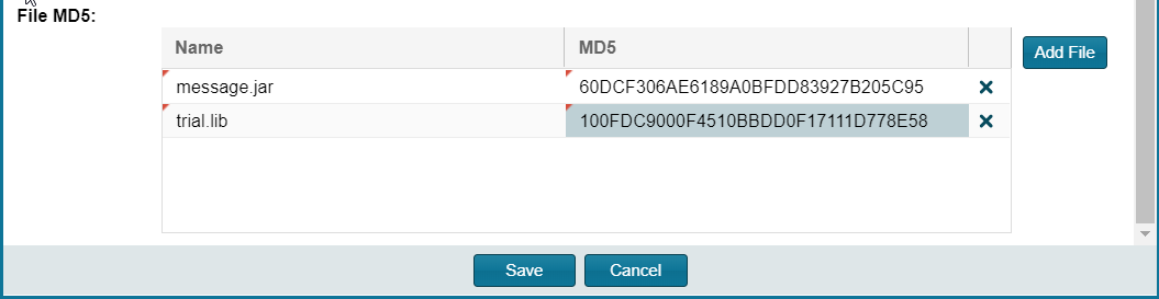 For each codebase file you want to add to the rule, click the Add File button and provide the file’s name and MD5 value. |
