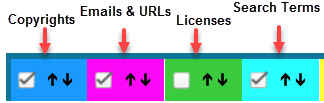 To view the instances of other types of evidence (for example, copyrights, licenses, URLs, email addresses, and search terms) in the codebase file, click the appropriate color-coded selection boxes at the top of the Partial Matches tab: |