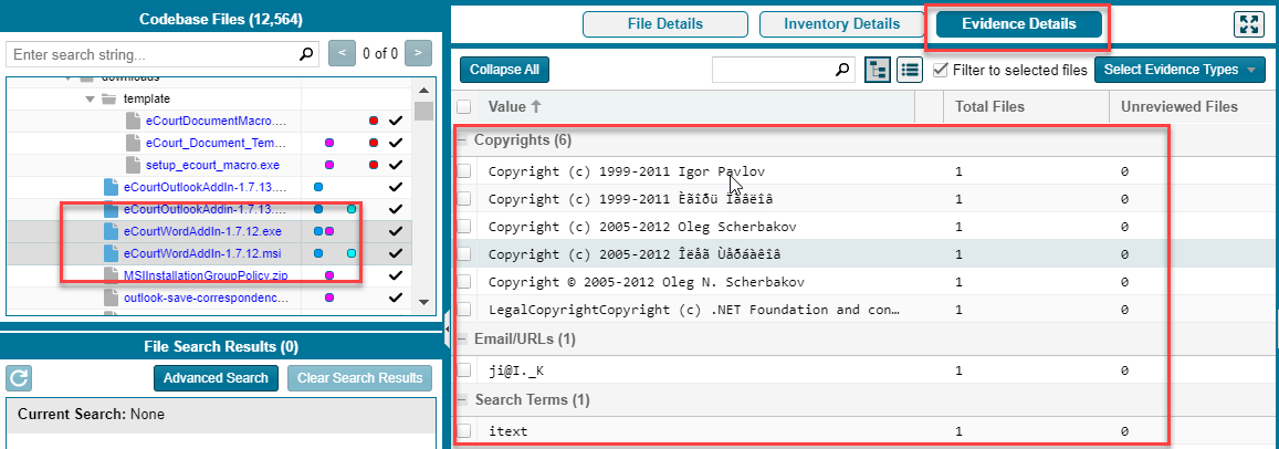 The associated files are listed in the Files Search Results pane. (You can also select multiple evidence instances in this step.) For more details about using the Evidence Details tab, see Examining Evidence of Open-Source Copyrights, Email Addresses, URLs, Licenses, and Search Terms in a Given Non-Binary File.
