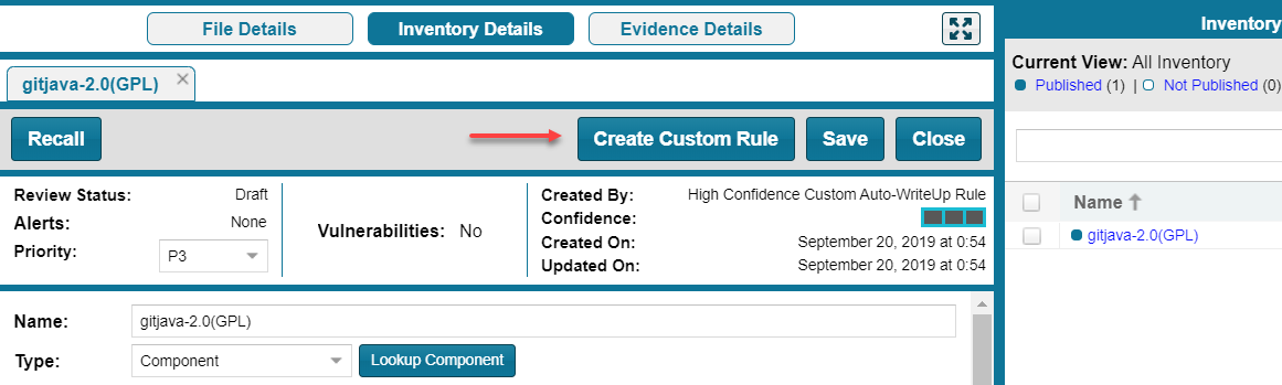 During codebase analysis in the Analysis Workbench for a project, you might find one or more codebase files that are associated with a specific third-party component but are not associated with current inventory. You can manually update the existing inventory item associated with the component to include the files or, if inventory does not exist, create an inventory item based on the component and associate the files. (The inventory item type must be defined as Component.) You then have the option to create a global custom detection rule based on the details of the updated or created inventory item, as described in the following procedure. This method pre-populates much of the information needed to create the rule, including the MD5 value for each file associated with the inventory item.