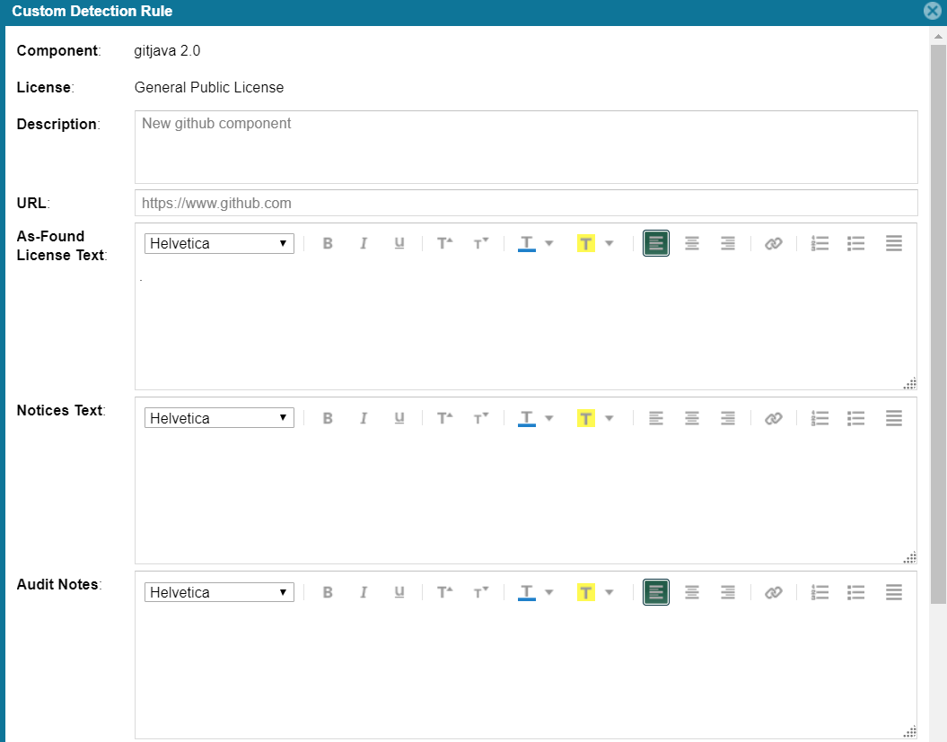 3. | Add or edit As-Found License Text, Notices Text, and Audit Notes content as needed for the rule. (These fields are pre-populated with any content currently defined in the inventory item on which you are basing the rule.) This information is displayed for inventory items automatically created or updated by the rule in the future. |