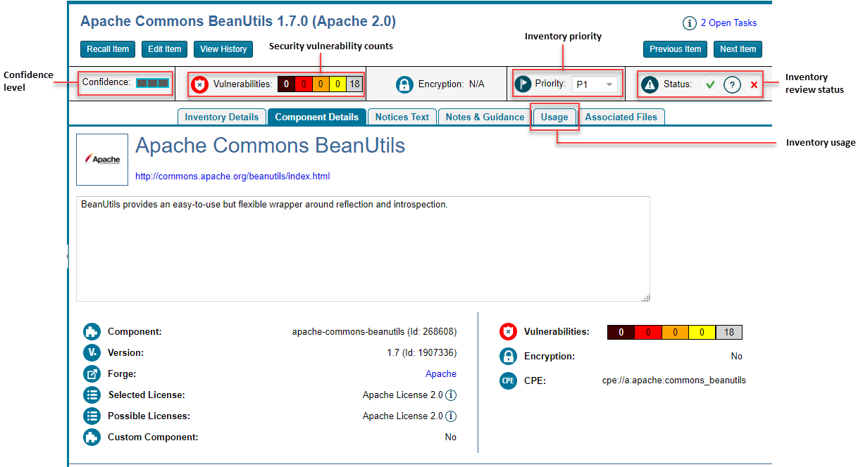 The following example highlights these elements for a given inventory item on the Project Inventory tab. Many of these same elements are available in the inventory view in the Analysis Workbench. (For more information about the Analysis Workbench, see Auditing Scan Results in the Analysis Workbench . For information about the Project Inventory tab, see Reviewing Published Inventory for a Project.)