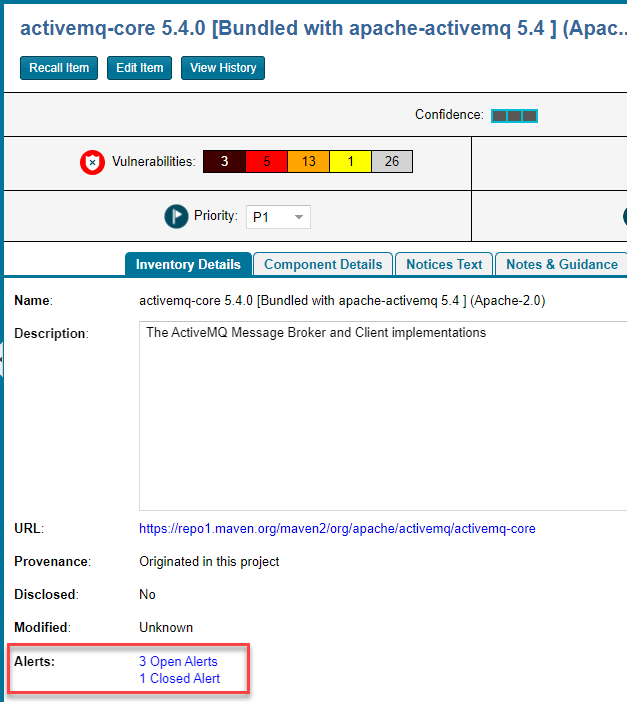 This procedure describes how to access the security vulnerability alerts for a specific inventory item from the Project Inventory tab for a project.