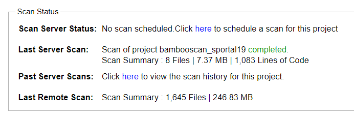 | • | Click the “here” link in Scan Server Status to schedule a scan. If other scans are running, the scan is queued and will automatically run based on queue order. If the Scan Server is inactive, the scan will automatically start based on queue order once the server is running again. (Click the link in Past Scans to view details about the scheduled scan.) |