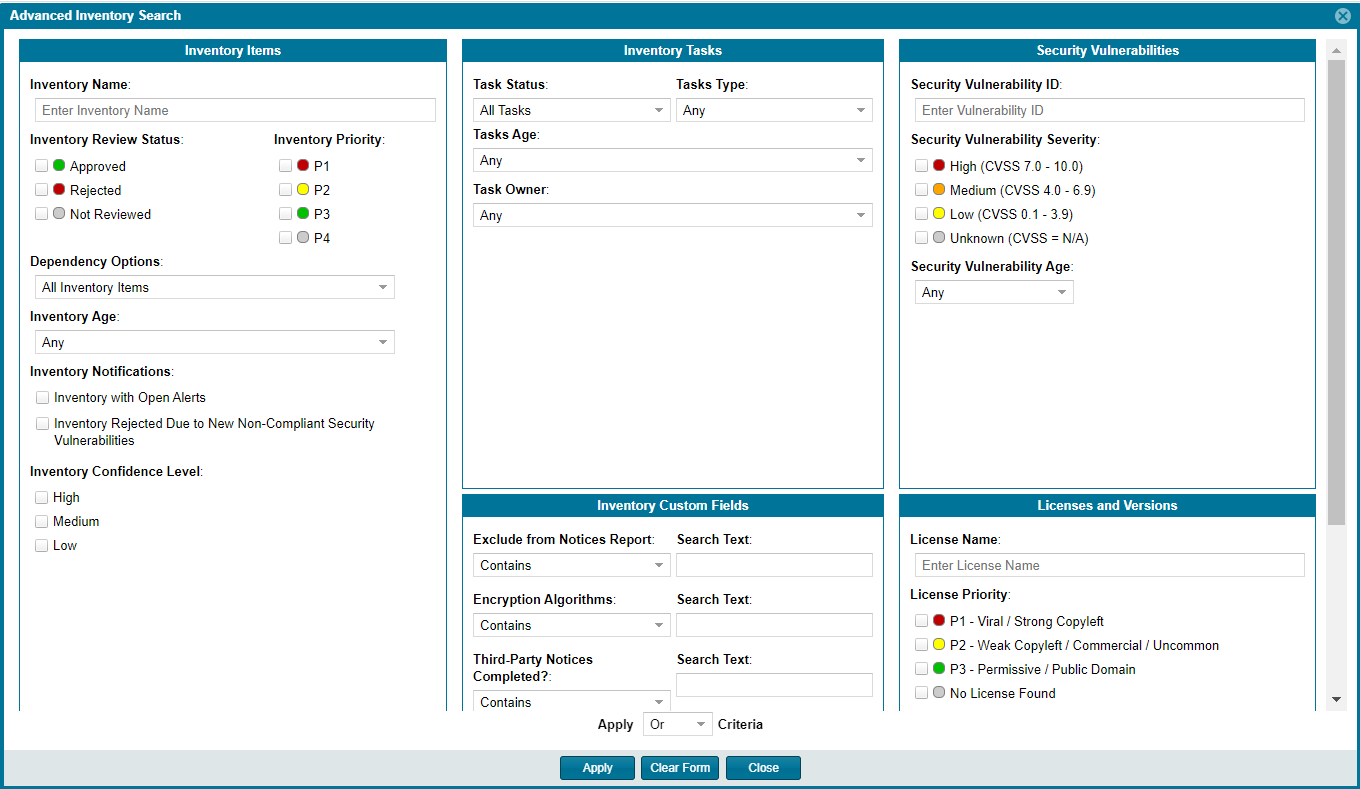 Inventory Items—Search for inventory items that have a certain name (or string), priority, review status, or age or that have open vulnerability alerts and work items. (For details on alerts and work items, see Managing Security Vulnerability Alerts and Creating and Viewing External Work Items for a Project Inventory Task.)