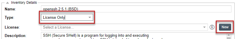 Note:Generally you create a License Only inventory item if you know the license for the third-party code or artifact but do not know the component. (You can later edit this inventory item to convert it to one of the other inventory types.) This type of inventory is typically used for groups of files of unknown origin that are governed by a specific license. When you select the license, the inventory name is automatically generated as Files under <LICENSE NAME> License.