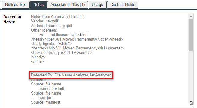 Detection Notes—Information generated during the scan to explain the means by which the scan detected OSS or third-party software in the codebase. The Detected By attribute in the Detection Notes content indicates the automated detection technique(s) responsible for the inventory finding. The following example shows that the detection techniques used to find the inventory item included File Name Analyzer and Jar Analyzer.