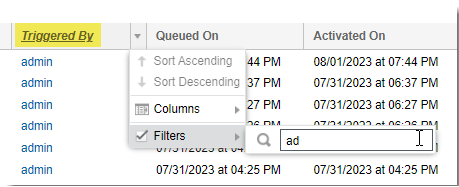 • | For Project Name or Triggered By, enter the name (or a string within the name) of the project or of the user who triggered the job, respectively. When you begin typing, the Filters checkbox is automatically selected, and the queue is filtered as you type. |