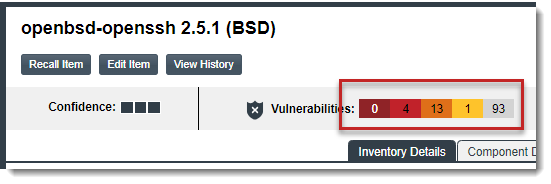 You are returned to the Security Vulnerabilities window, which no longer lists the vulnerability you just suppressed for the project. However, if no vulnerabilities remain for the component version on the window, you are returned to the Inventory Details pane/tab. Note that count on the Vulnerabilities bar graph count is now reduced by one.