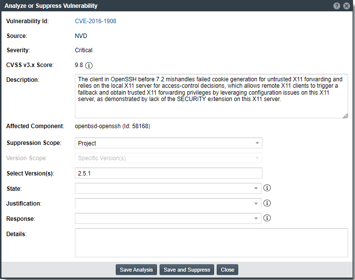 • | Click the Save and Suppress button to save the current exclusion analysis and suppress the vulnerability for the current project. (All editable fields must be completed to successfully suppress the vulnerability.) |