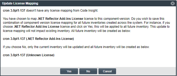 The Update License Mapping window provides the option to save your new license mapping at the system level so that all future inventory system-generated for the component version across projects will be associated with the license. The window also explains what happens when the mapping is save at the system level to help you make an informed decision.