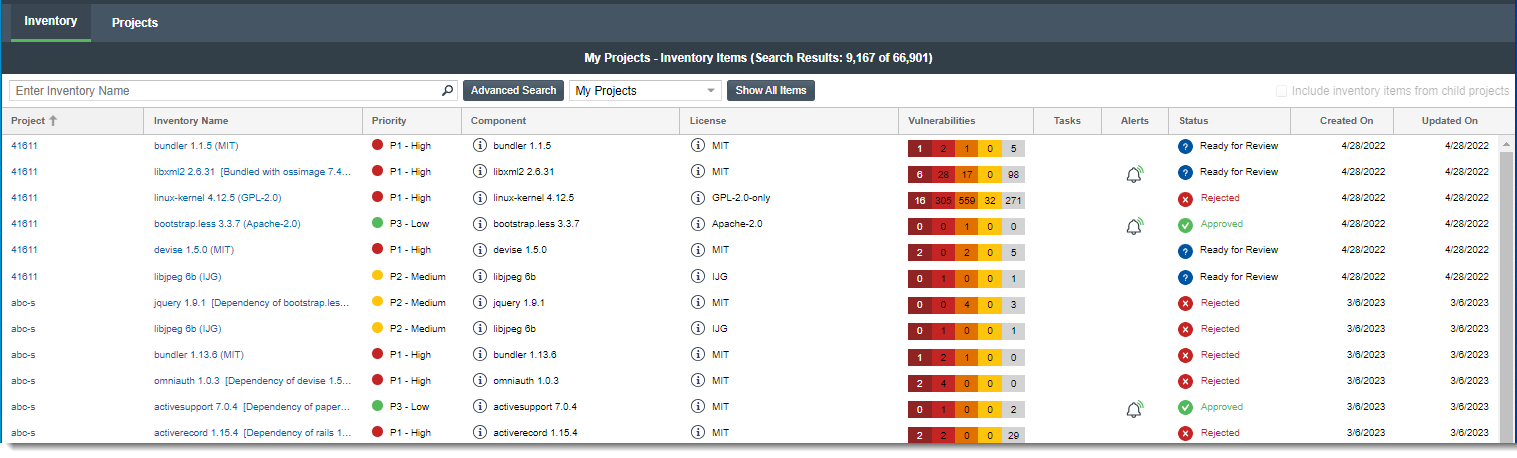From the Code Insight dashboard (which is displayed when you start Code Insight), click view inventory. See Opening Code Insight for details on accessing this dashboard.