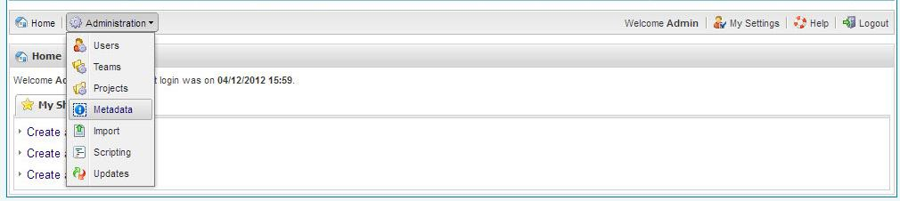 Click the Administration button on the Main menu, and select Metadata from the pull-down menu: |