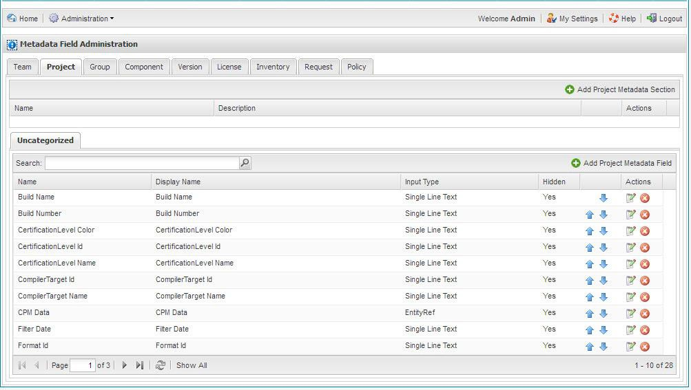 Metadata fields are organized into metadata sections for a given entity to allow for a logical grouping of related data. The Metadata Field Administration page is comprised of tabbed types of metadata and each tabbed page is split into two sections as shown in Figure 88.