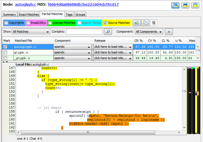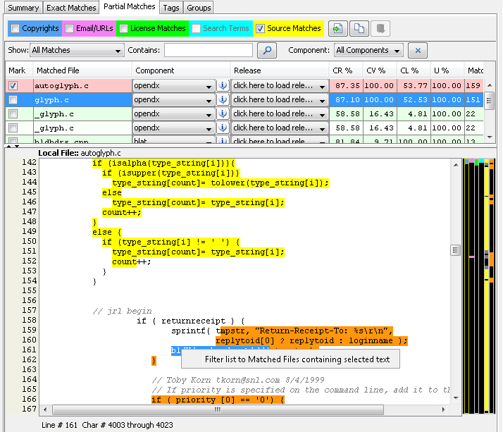 This is done via the orange side bar and orange source match highlighting in the partial matches panel. It represents the union of all source matches across all matched files that are not represented via the currently selected matched file. This allows an auditor to quickly determine whether there are additional source code fingerprint matches in the scanned file that can be explained via an alternate set of matched files.