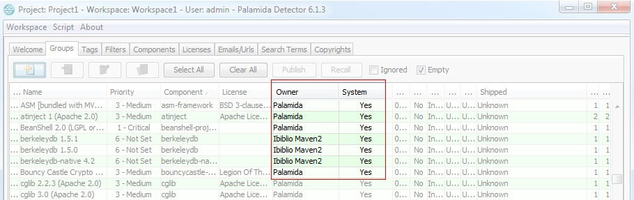 Each group created by Auto-WriteUp™ is marked as a System group. The Owner column in the Code Insight Detector Client lists the forge associated with the group. The Code Insight forge indicates a group was created with rules manually verified by Code Insight analysts. Other forges indicate the group was created by auto- generated High-Volume Rules.