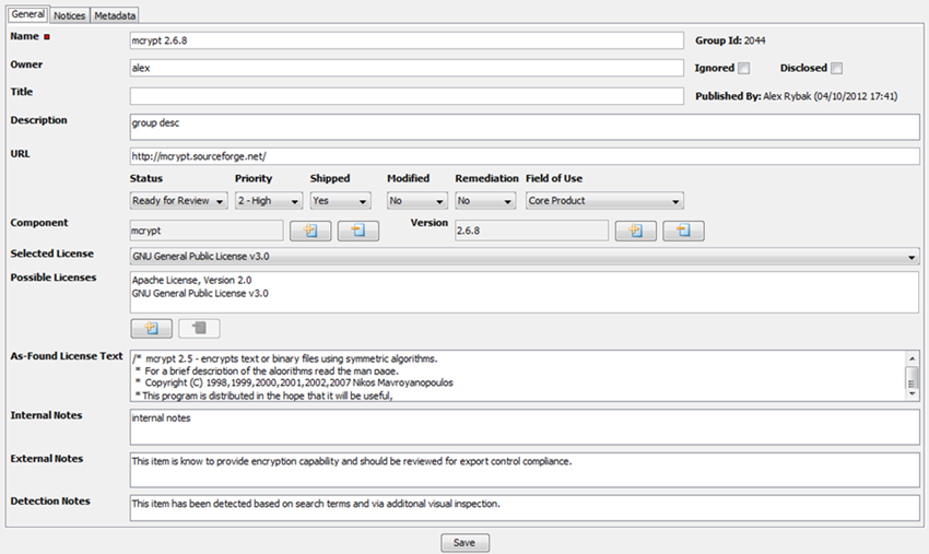 Components, Versions, Selected Licenses, Possible Licenses, As Found License text, Internal Notes, External Notes, and Detection Notes (read-only) |