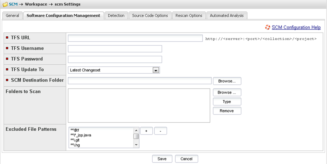| 2. | Click on the Software Configuration Management tab, and the Software Configuration Management screen appears. On this screen, you can enter your TFS configuration options. |