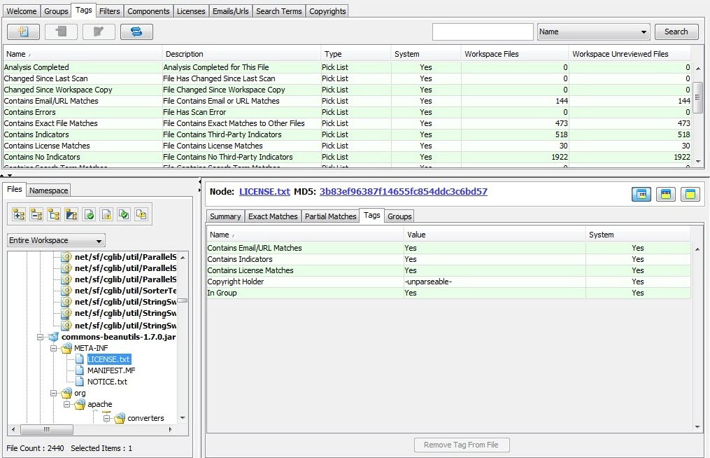 Note:Adding a tag to inner files of an archive will not automatically add the tag to the archive outer file and adding a tag to the archive outer file will not automatically add the tag to the archive’s inner files. Tag file counts in the “Workspace Files” and “Workspace Unreviewed Files” columns reflect this behavior and may be significantly smaller than the File Count in the file tree.