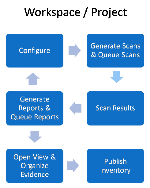 A general view of the auditor workflow is presented in the following diagram. If the scan is not providing you with the information you are seeking, you can re-configure the workspace and schedule a new scan to analyze.