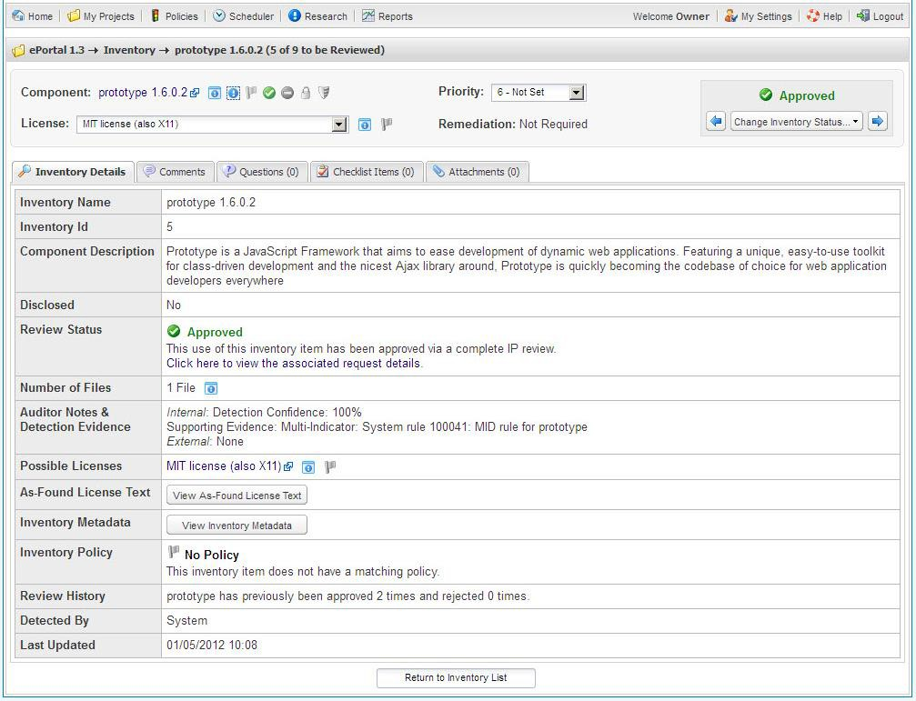 The Inventory Details tab contains all the information necessary to determine whether to approve, reject, or schedule a full review for the item.