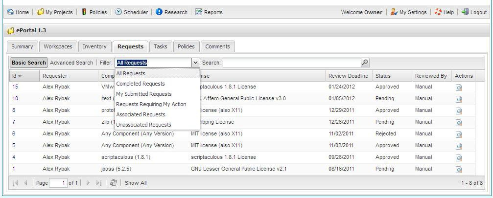 | 4. | If you log in as an Owner, you can select All Request, Completed Requests, My Submitted Requests, Requests Requiring My Action, Associated Requests, Unassociated Requests: |