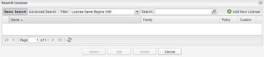 Select the desired license to add. You can also edit or delete a license by using the buttons at the bottom of the Search License dialog, or you can create a new license if one does not exist. |