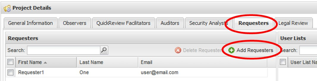 Add a user able to submit new requests in the project by clicking on the Requesters tab and adding the Requester1 user. |