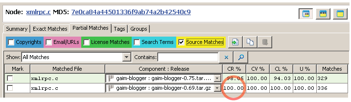 Click the Partial Matches tab and click the colored checkboxes at the top of the panel to show where in the code there are copyright, URL, license matches or search terms. |