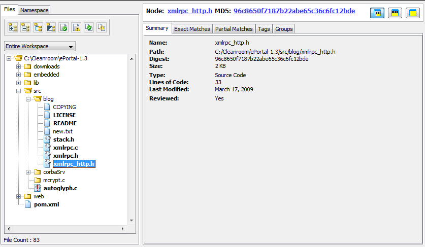 | 2. | Click on any file in the tree. Files are decorated depending on the types of evidence present in the file. Depending on whether the scanned file is source, archive, or other type of file, the icon preceding it is representative of the file type. The following file notations are available: |