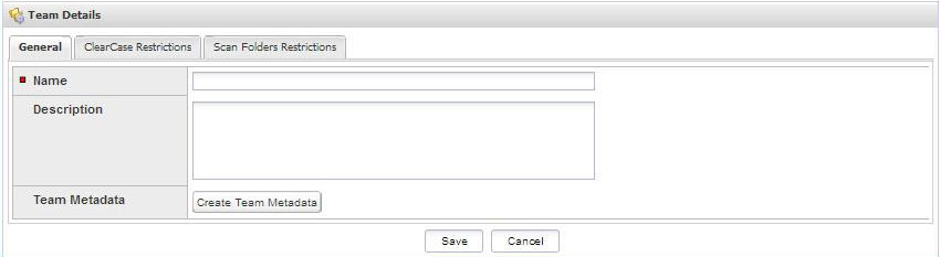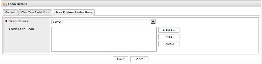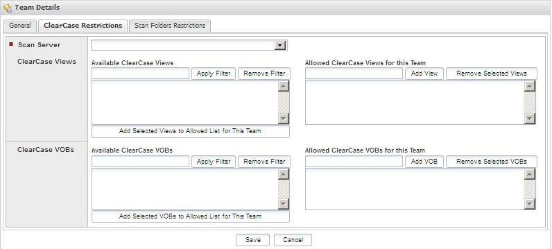 This tab is used to restrict which ClearCase views and VOBs may be used for scanning by all projects under this team.