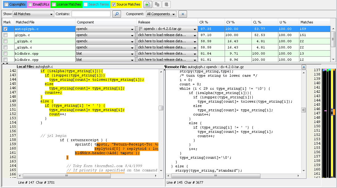 Select a row in the matches table to highlight the currently selected node in the file tree with the source code matches that were detected from the selected remote file. The data in the table can be sorted by any of the columns. The following acronyms are used in the column headings to save space: |