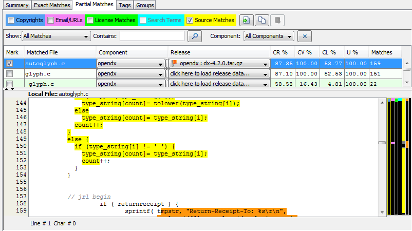 Select the Partial Matches tab in the file details panel and ensure that the SCF Matches checkbox is checked to view a list of third-party files for which there are source matches. |