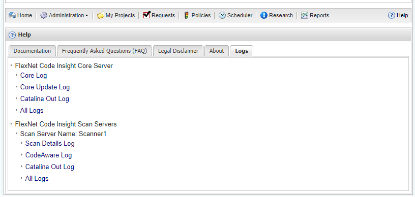 Code Insight allows you download selected Code Insight log files that have been generated for the Core Server and each Scan Server. The downloads are in .zip format, enabling you to easily distribute log files as needed for analysis or troubleshooting purposes.