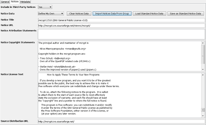 A third-party notice can either be defined from scratch for the current group or loaded (using the Load Standard Notice Data button) from the Standard Notices data (if available) and modified as needed. A standard notice applies if the component, version, and license of the notice matches that of the current group. If a standard notice is loaded, it can be modified and saved (using the Save as Standard Notice Data button) as an updated version of the standard notice, or just used for the current group.