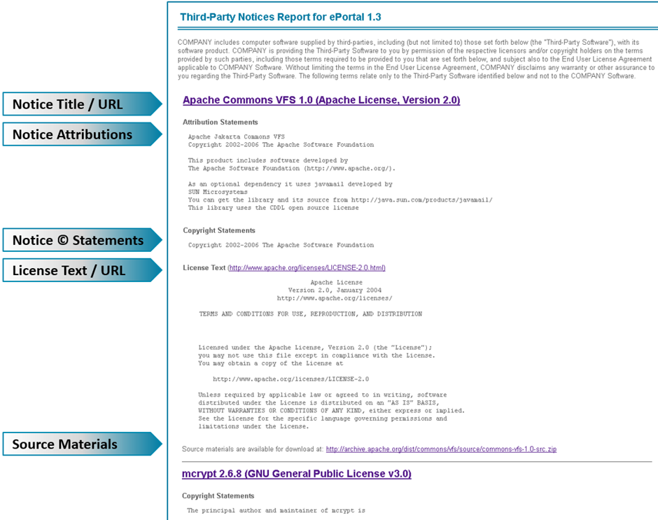 Code Insight provides a standard third-party notices feature in the product to make this a simple byproduct of the auditing work performed in the product. The following fields comprise a third-party notice for the use of a particular piece of TP/OSS: