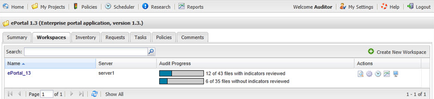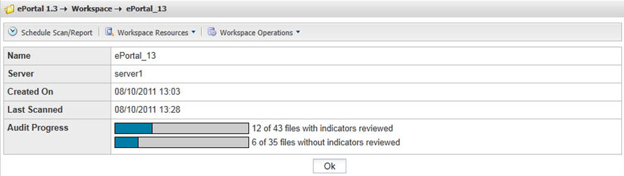 Click the name of the workspace link in the Name column or the associated magnifying glass icon in the Action column that you wish to scan. The Workspace Details page appears. |