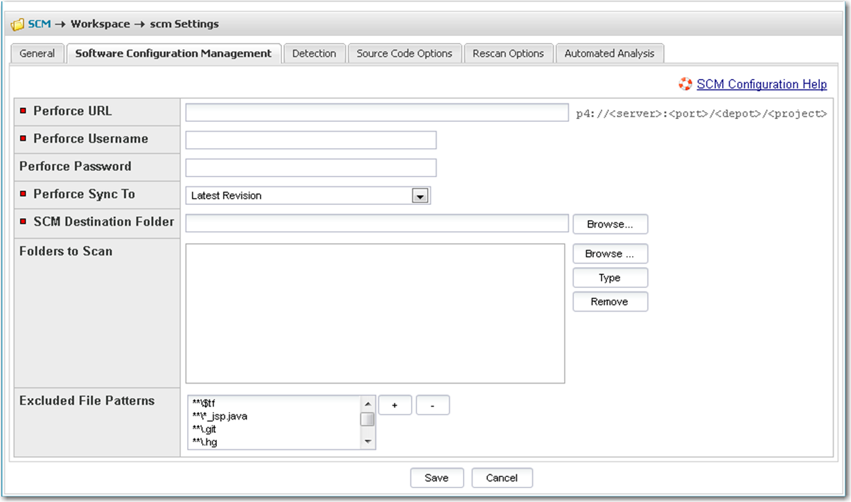 | 2. | Click on the Software Configuration Management tab, and the Software Configuration Management tab screen opens as shown below. On this screen, you can enter your Perforce configuration options. |