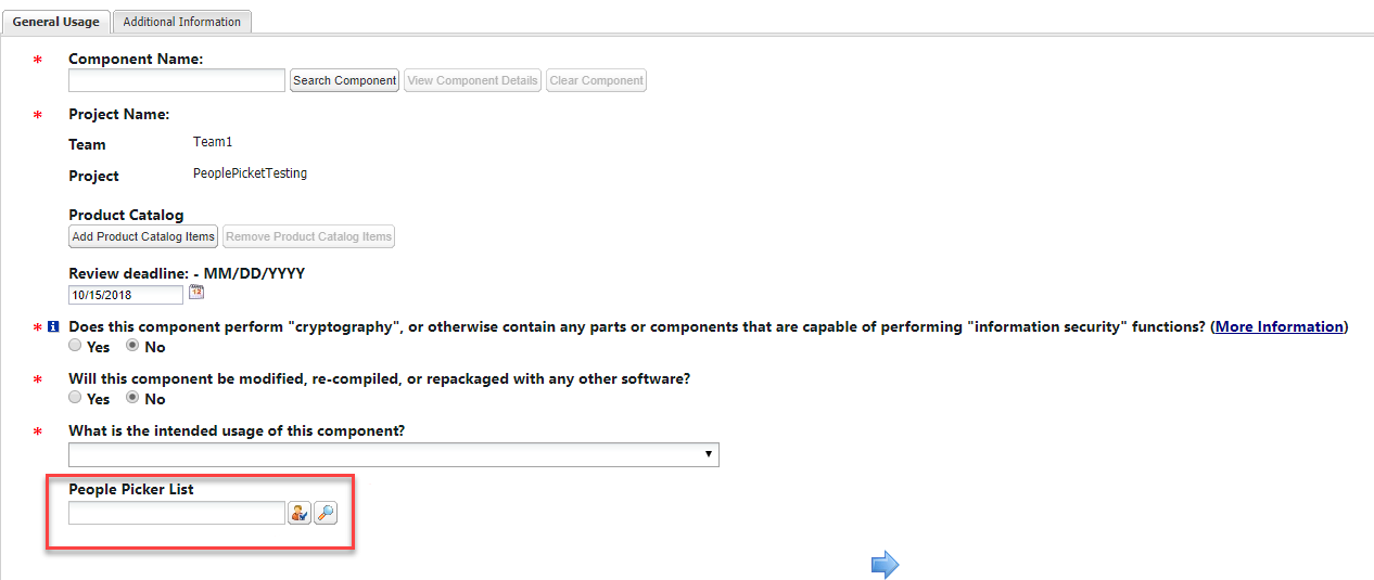 | 6. | In Code Insight user interface, open a project, navigate to the appropriate “review level” tab on the Project Details page, and select the newly created field from the Select request form field containing reviewers for this review level drop-down list. In this example, you would select People Picker List. |