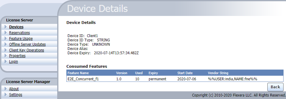 Note that the Device Expiry field in the Device Details section shows the timestamp when all currently checked-out features will expire on the device. This timestamp is determined either by the borrow expiration for the checked-out concurrent features or the final expiration date (as defined in the back office) for checked-out metered features.