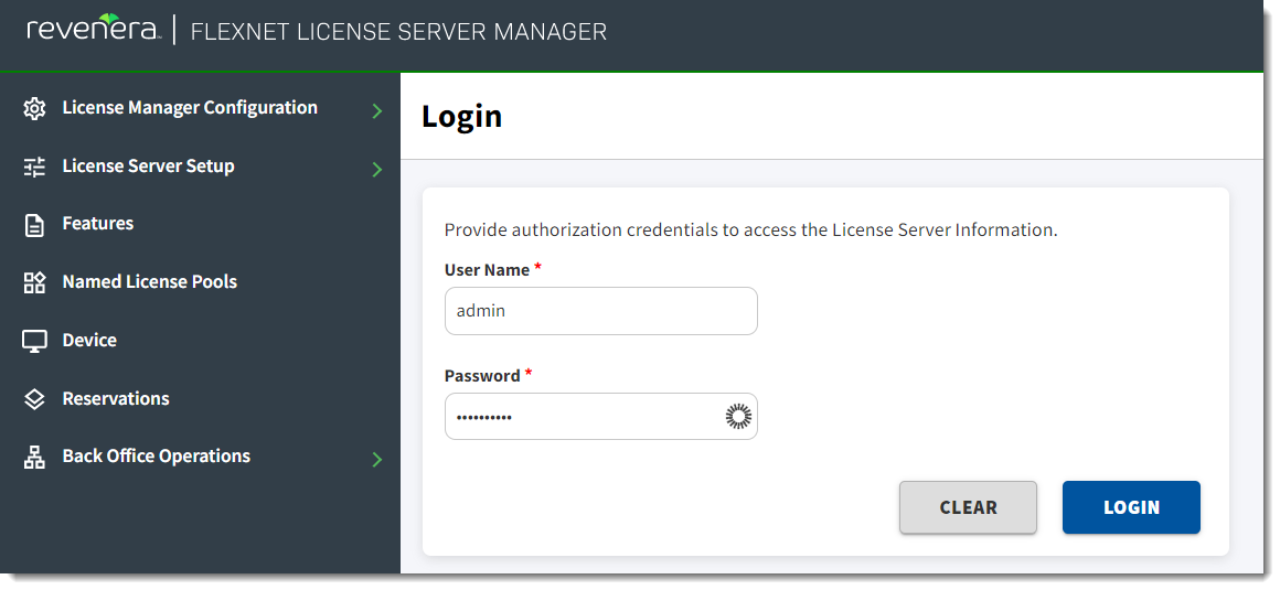 Once the credentials have been verified, you can use the License Server Manager to perform the administrative operations for which you are authorized.