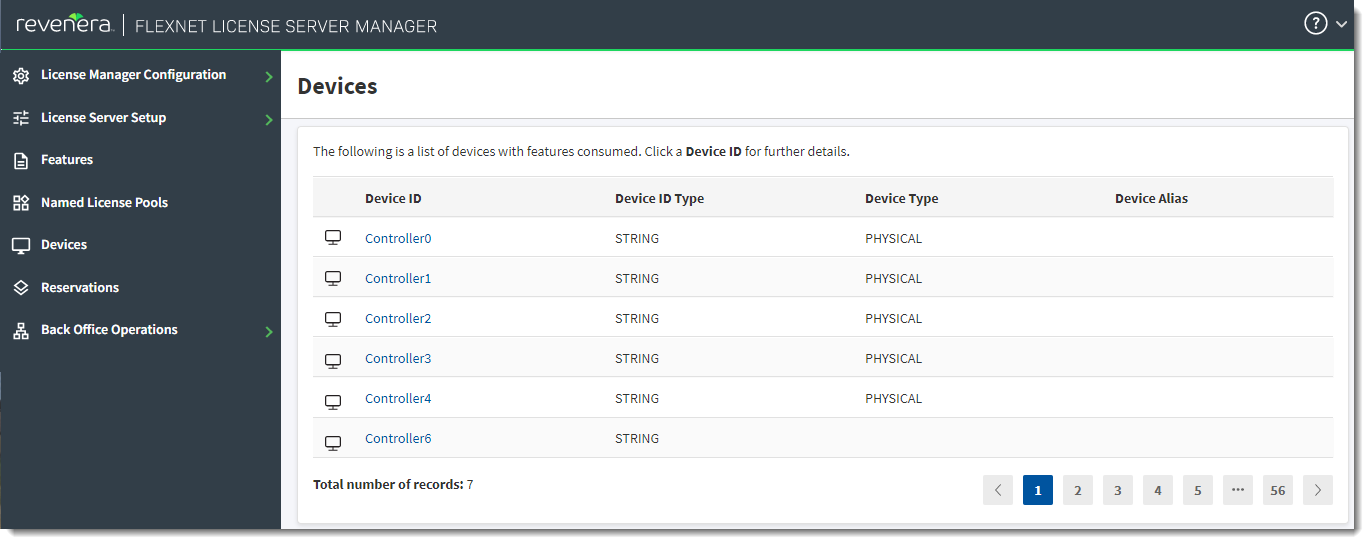 If the list of devices is extensive, you can use the navigation tool to locate records, as described in Page Navigation for Views in the License Server Manager.