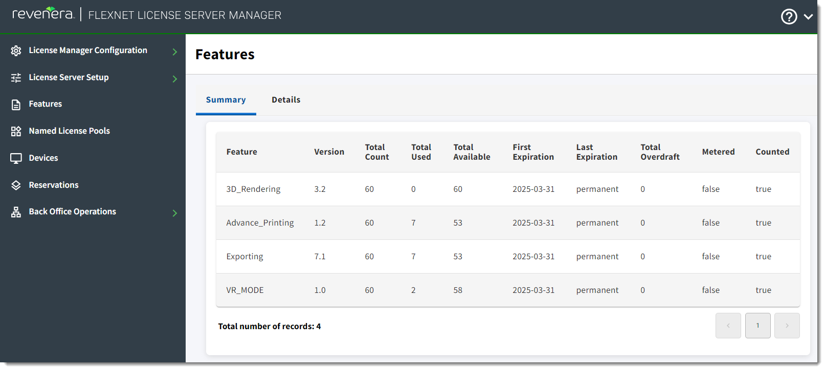 The Features view displays all the features installed on the license server.