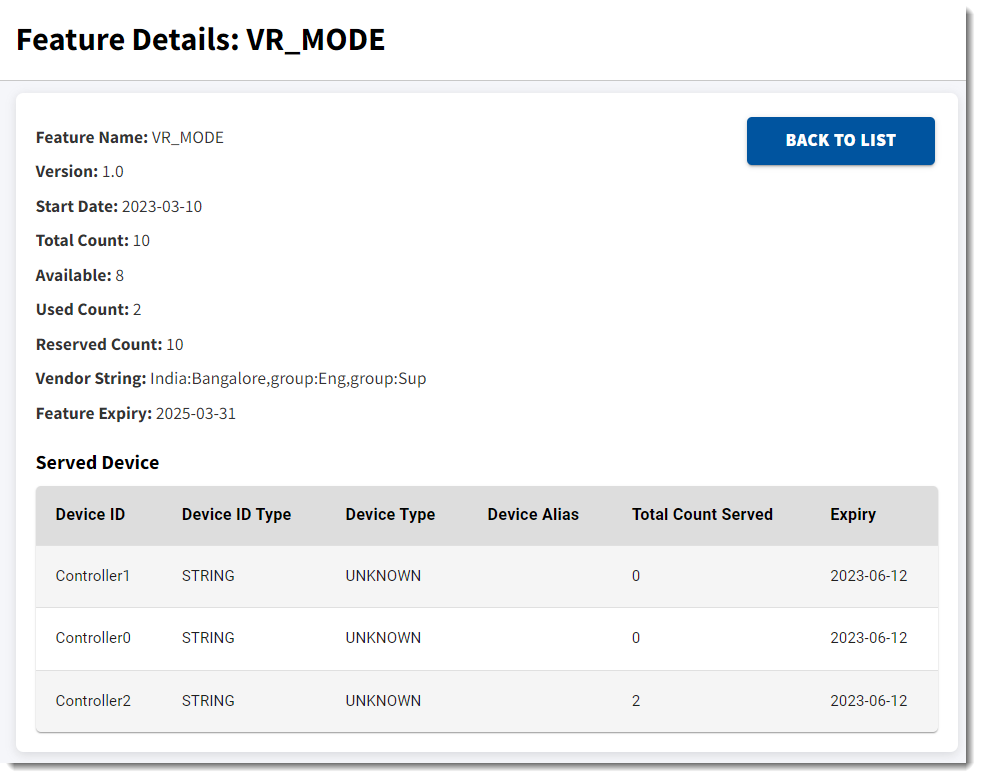 This page also shows a Served Info section, listing the client devices that currently have the feature’s counts checked out.