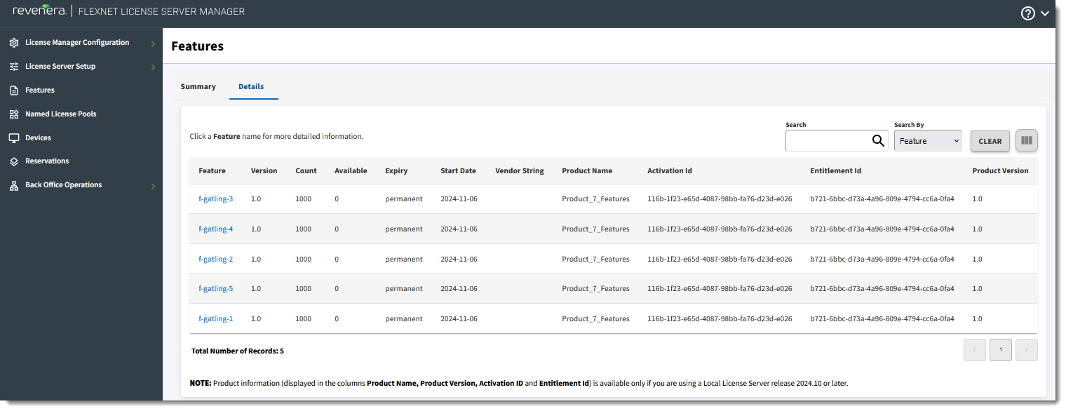 Note:The columns Product Name, Product Version, Activation Id and Entitlement ID display product information for features on a local license server only if the local license server is running release 2024.10 or later.