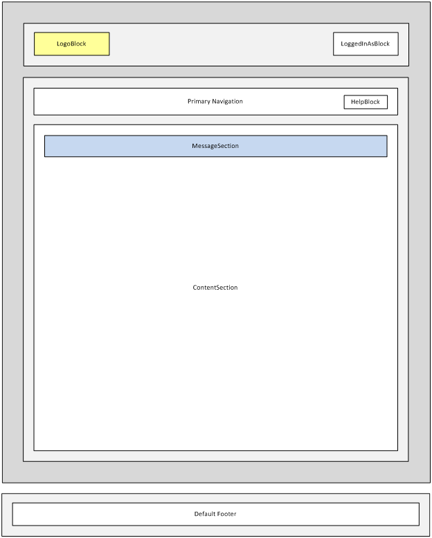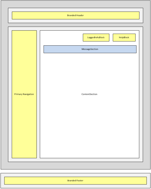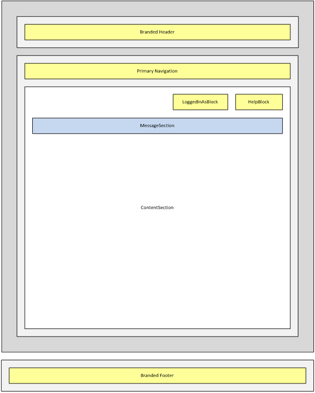 The following graphics illustrate the general page structure as well as specific page structure for scenarios where a custom header and footer have been applied and also where a custom header and footer have been applied with navigation left-aligned.