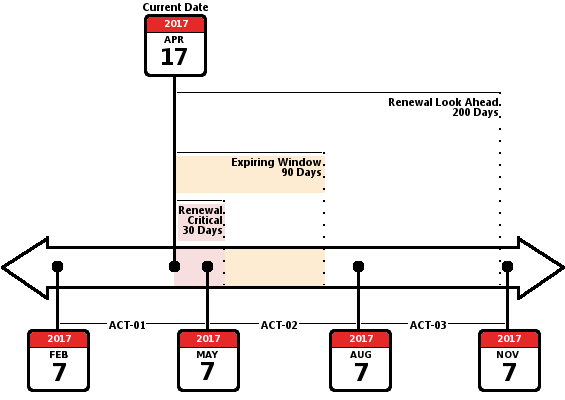 | • | ACT-03 expires on 7 November 2017. Because its expiration date happens outside the Renewal Look Ahead range (default: 200 days), it is not shown on the Expiring Entitlements page. (There are 204 days between 17 April 2017 and 7 November 2017. If its expiration date fell within the Renewal Look Ahead range, this line would be included on the Expiring Entitlements page.) |
