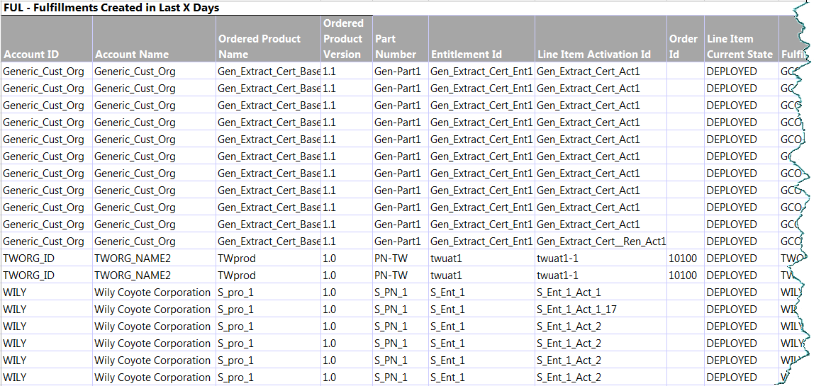 The Fulfillments Created in Last X Days report shows recently created fulfillments with information about their owner, entitlement ID, activation ID, product name and version, as well as the entitlement lines’ creation, expiration, and maintenance end dates.