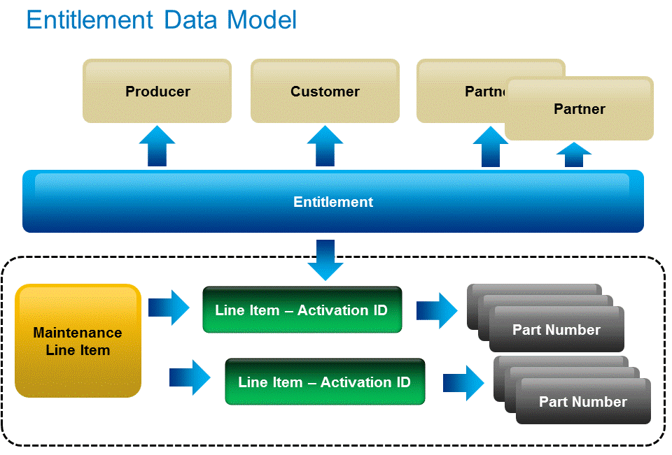 An entitlement represents your customers’ rights to use your software. An entitlement acts as a container for the licenses purchased in a single order. It is analogous to a bank account: an entitlement contains rights to one or more licenses, and the customer can redeem licenses from or return licenses to this account. The figure below depicts the relationships among entitlements, customers, and line items.