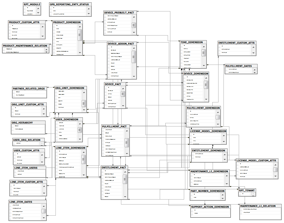 This schema diagram illustrates the tables in the FlexNet Operations reporting database and the relationships among them. Subsequent diagrams focus on relationships between individual fact tables and their foreign key links with dimension tables.